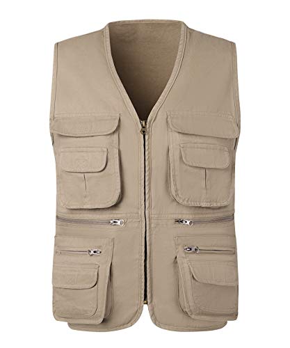KTWOLEN Hombres Chaleco de Pesca de Algodón con Multibolsillos Aire Libre Casual Respirable Chaleco para Cámping Fotografía Caza Senderismo Viajes, Beige, XL