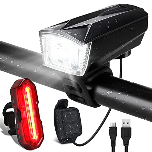 Luces Bicicleta Delantera y Trasera Linterna Bicicleta Recargable USB, 5+6 Modes con IP65 Resistente, Giratoria 360 ° Bocina y Luz para Carretera y Montaña, Control Remoto