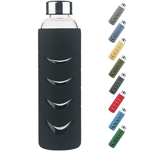 Botella de Agua de Cristal - 500 ml / 1 L Botella de Agua de Vidrio de Borosilicato sin BPA con Tapa a Prueba de Fugas y Funda Protectora de Silicona, Perfecta para Oficina, Fitness, Viajes