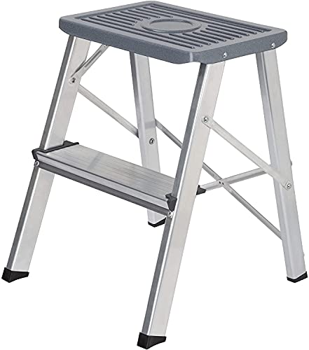 - [¿Lo más importante para una escalera?] ¡Estabilidad! Esta escalera plegable de dos niveles está hecha de acero y soporta hasta 150 kg. Cuando cambias una bombilla, puedes concentrarte en lo que estás haciendo sin tener miedo